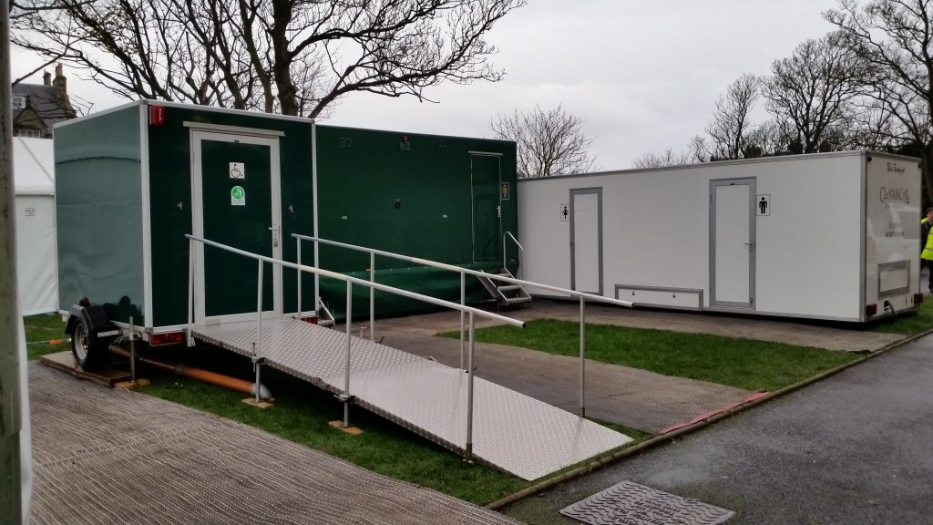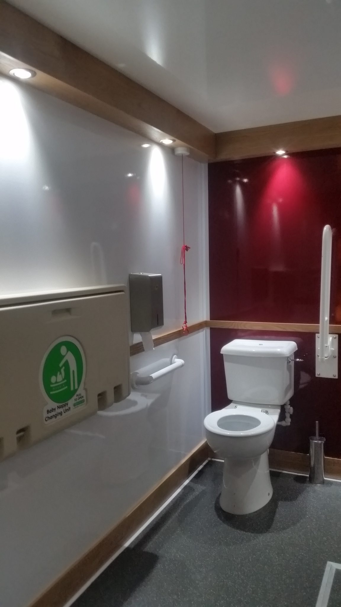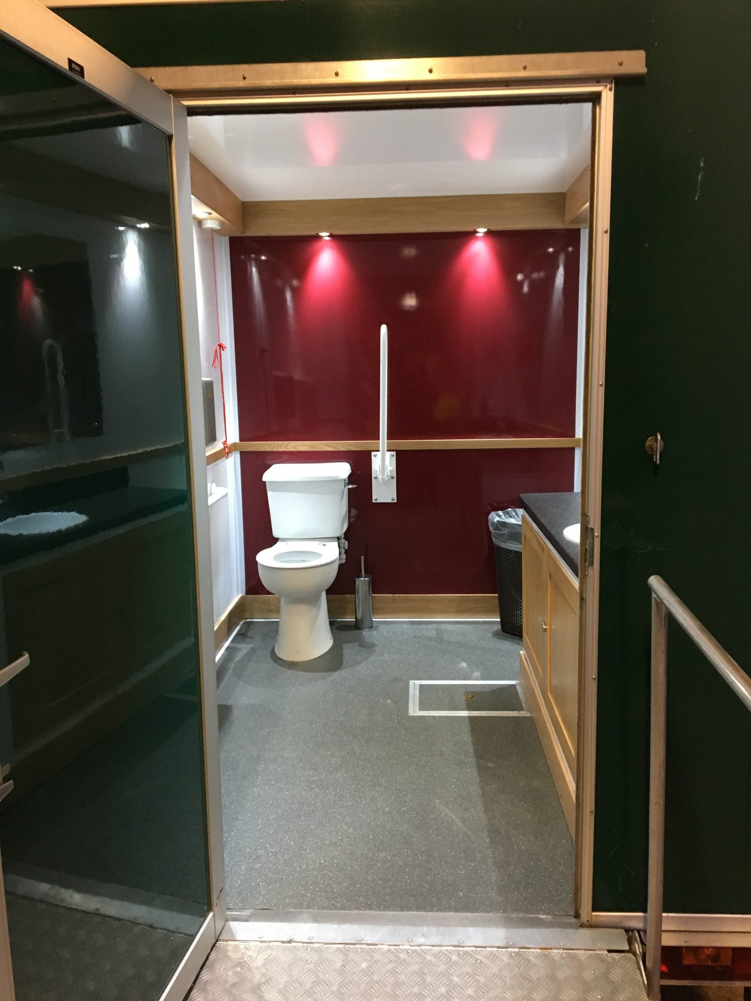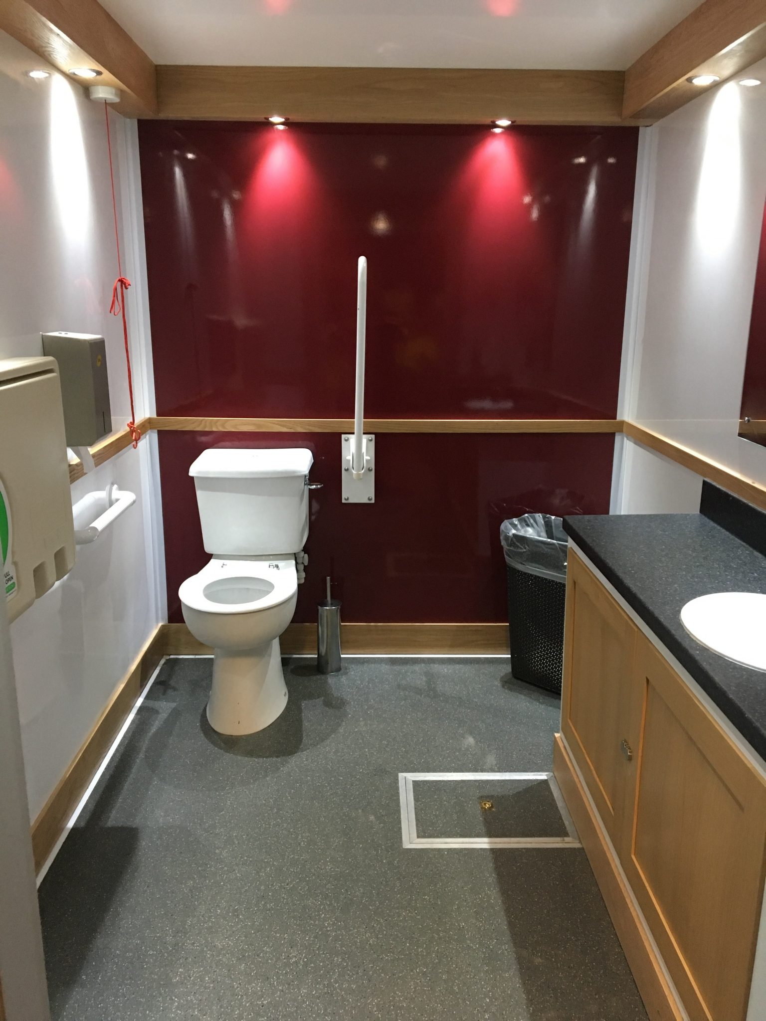 Where wheelchair access or baby changing facilities are required, we have specially designed disabled toilet units for these purposes. Each unit has a green exterior and includes one basin and one toilet as standard, with necessary aids for the user, and a wall-hung baby changing platform installed with restraint straps. As this unit is dedicated to less-able users only usage is limited to 50 over an 8-hour period. (Layout may vary)